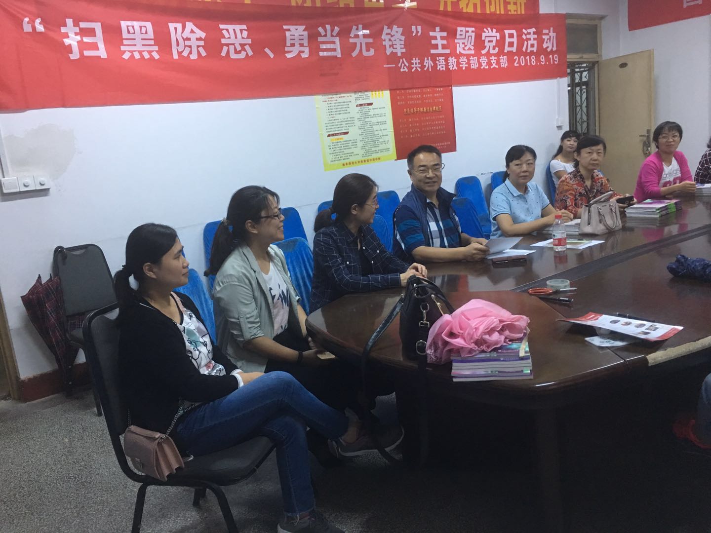 9月19日下午,公共外语教学部江南网官方站入口_江南(中国)党支部开展“扫黑除恶,弘扬正气”主题党日活动。活动由党支部副书记刘成干同志主持。