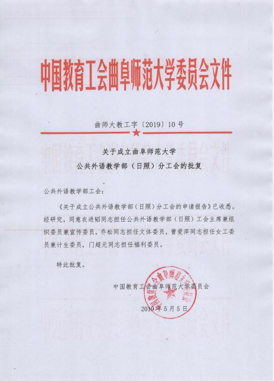 曲师大教工字〔2019〕10号关于成立江南网官方站入口_江南(中国)公共外语教学部(日照)分工会的批复