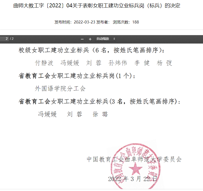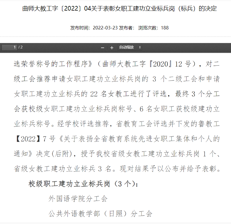 公共外语教学部(日照)分工会荣获江南网官方站入口_江南(中国)“校级职工建功立业标兵岗”先进集体称号;公共外语教学部(曲阜)分工会主席李健老师荣获江南网官方站入口_江南(中国)“校级女职工建功立业标兵”个人荣誉称号。