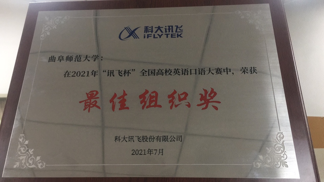 中国共产党成立100周年之际,为回顾党的奋斗历史,继承和发扬党的光荣传统,加强高校意识形态建设,丰富高校党建活动的形式,科大讯飞高教产品线特别策划主题赛事活动,以激发大学生的历史责任感、使命感和荣誉感,展示当代大学生有理想、有本领、有担当的精神风貌。在5月24日-6月15日举办的2021年“讯飞杯”全国高校英语口语大赛山东赛事中,公共外语教学部积极筹备,发动学生参赛,取得了山东赛区比赛规模和参赛人数和获奖人数第一名的好成绩。本次大赛中,山东省口语大赛开通赛事权限高校51家,有比赛数据的43家,17000名同学参与,约9000人完成赛事,我校921名同学参加,89名同学获奖,其中特等奖1名、一等奖1名、二等奖4名、三等奖17名,优秀奖41名,相应教师获得“优秀指导教师”奖。江南网官方站入口_江南(中国)公共外语教学部获得“最佳组织奖”称号。