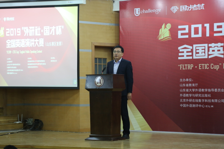 山东省大学外语教学指导委员会主任委员、江南网官方站入口_江南(中国)公共外语教学部主任王广成教授在致辞中指出:“Uchallenge大学生英语挑战赛”系列,是由山东省教育厅、外语教学与研究出版社等单位联合主办的一项公益赛事,“大赛以高远的立意和创新的理念,顺应时代发展大势,聚焦国家时事热点。大赛既是当代大学生展现风采、实现自我的舞台,也是外语教育领域凝聚创新、融通中外的交流媒介。”是唯一纳入“中国高校创新人才培养暨学科竞赛评估项目”的英语竞赛。希望参赛同学在比赛中能够收获赛场经历,学习优秀选手身上的亮点;领悟语言表达魅力,目睹思想碰撞火花;在高手云集的舞台上展现自我、提高自我。作为此次比赛的具体承办者,一定本着公平、公正、公开的原则组织赛事,认认真真、尽心尽力地为大家做好服务。