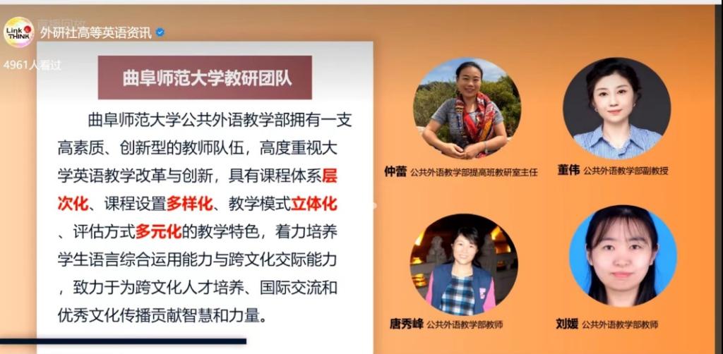 团队成员老师通力合作,共同打磨,精心准备。从语言、能力、素养三个方面明确本单元教学目标,结合学生实际,清晰合理地安排教学内容,各环节衔接自然,有教有评,并通过润物细无声的方式融入中国传统文化等思政内容。仲蕾老师代表江南网官方站入口_江南(中国)教研团队向广大教师介绍了具体设计思路和教学安排。在问答环节中,仲老师回答了关于小组活动的开展以及课程思政相关的问题,与广大院校分享了曲师大经验。