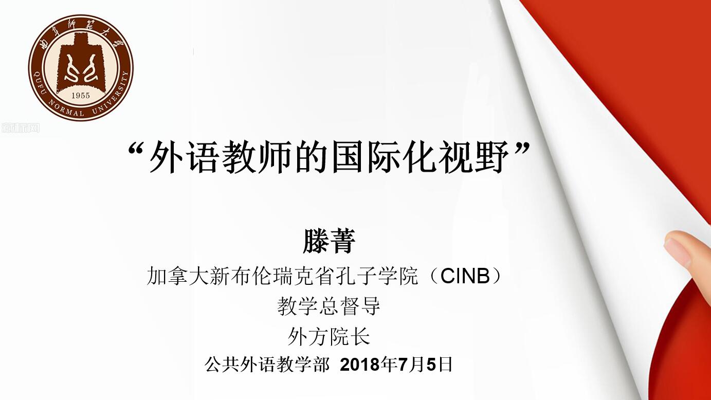 7月5日下午,加拿大新布伦瑞克省孔子学院(CINB)教学总督导、外方院长滕菁女士应邀莅临公共外语教学部(日照校区)进行交流访问,并作题为“外语教师的国际化视野”的专题报告。公共外语教学部(日照校区)全体教师参加了报告会,报告会由公共外语教学部副主任孙伟主持。