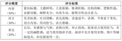 (1)即兴演讲:赛题保密,选手上场前20分钟抽题,即兴演讲时间为3分钟。